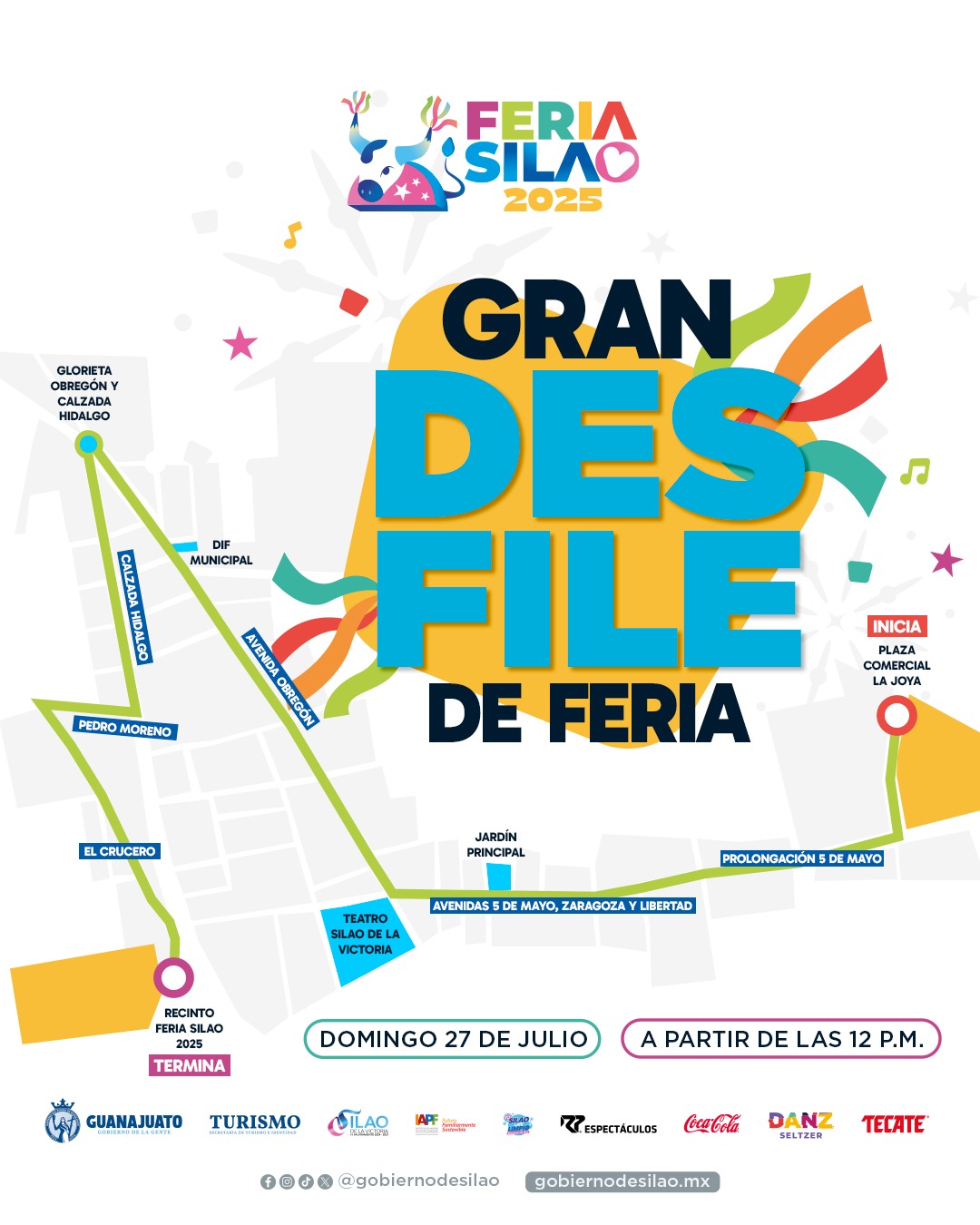 El desfile partirá de la plaza comercial La Joya y avanzará por la prolongación 5 de Mayo, la avenida del mismo nombre y las avenidas Zaragoza y Libertad. Posteriormente, tomará la avenida Álvaro Obregón y la calzada Miguel Hidalgo, para girar hacia la calle Pedro Moreno, pasar por el fraccionamiento El Crucero y, finalmente, desembocar en el nuevo recinto ferial, ubicado a un costado del distribuidor vial Silao-Romita.