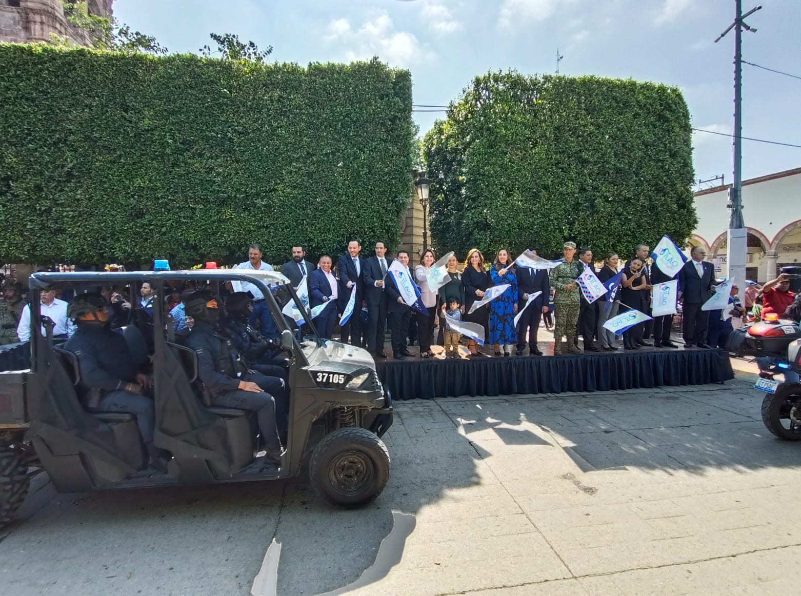 Junto con representantes de los Poderes Ejecutivo, Legislativo y Judicial del estado, la alcaldesa de Silao, Melanie Murillo, presidió la salida del convoy en el jardín principal, donde el público admiró diversos vehículos militares, un vehículo blindado de la Policía Estatal y el camión antimotines de la Secretaría local de Seguridad Ciudadana.